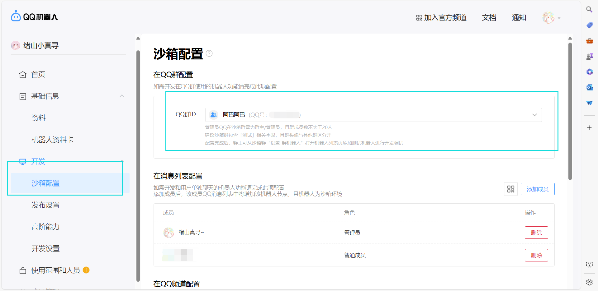 开发-沙箱配置后找到在QQ群配置将聊群修改为刚刚创建的聊群(如果失败就几秒后再试试)