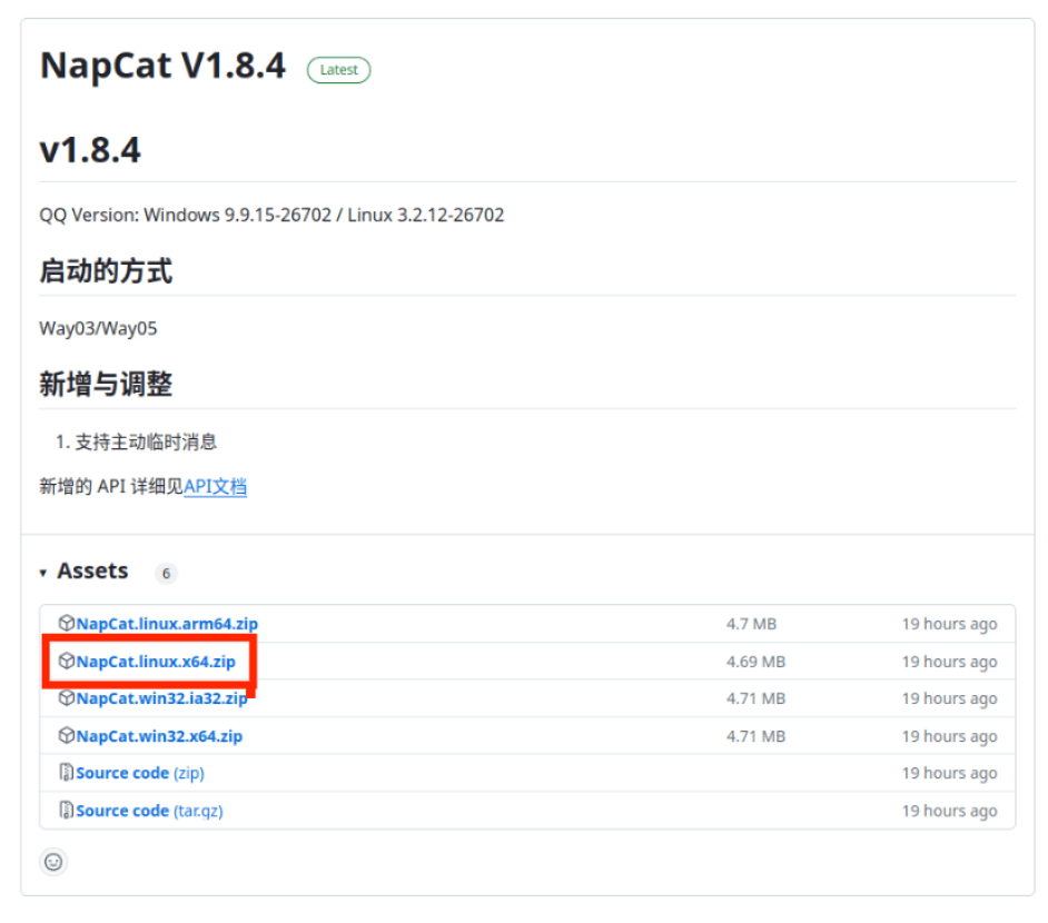 - 打开 Assets 下载 NapCat.linux.x64.zip 即可